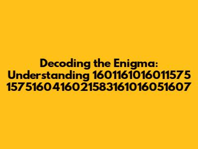 Let's start by dissecting the code itself: 1601161016011575 1575160416021583161016051607. The sequence is composed of several multi-digit numbers separated by spaces. This separation suggests that each number might represent a distinct element or component of the overall code. We can observe that the numbers vary in length, ranging from four to eight digits. This variation could indicate different levels of significance or different types of information encoded within each number. For example, shorter numbers might represent simpler values or categories, while longer numbers could contain more detailed or specific data.
